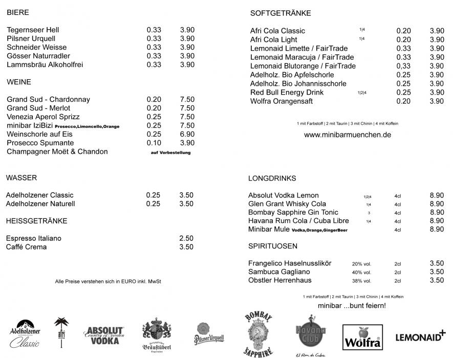 minibar Getränkekarte und Veranstaltungsoptionen